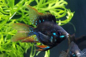ラミレジィは南米産の小型シクリッドで、優しい顔つきやその色彩で人気があり、体色の改良も進められてきた。ゴールデンに始まり、コバルトブルー、レインボー、近年ではブラックも流通するようになった。